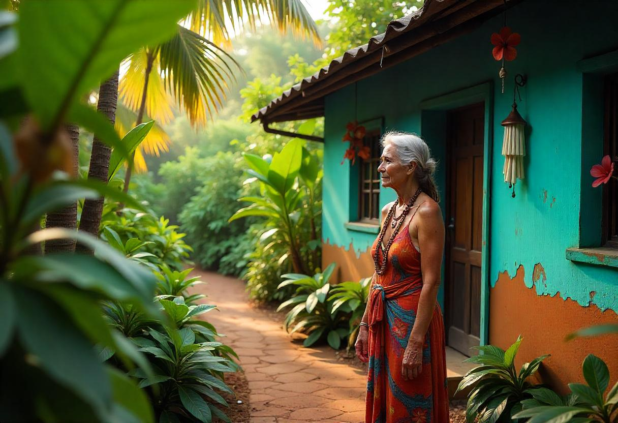 At the end of it, cradled in the wild, I found a weathered cottage — its walls peeling in faded shades of blue and ochre, a wind chime of shells and bones whispering lazy songs in the warm, salt-laced breeze.